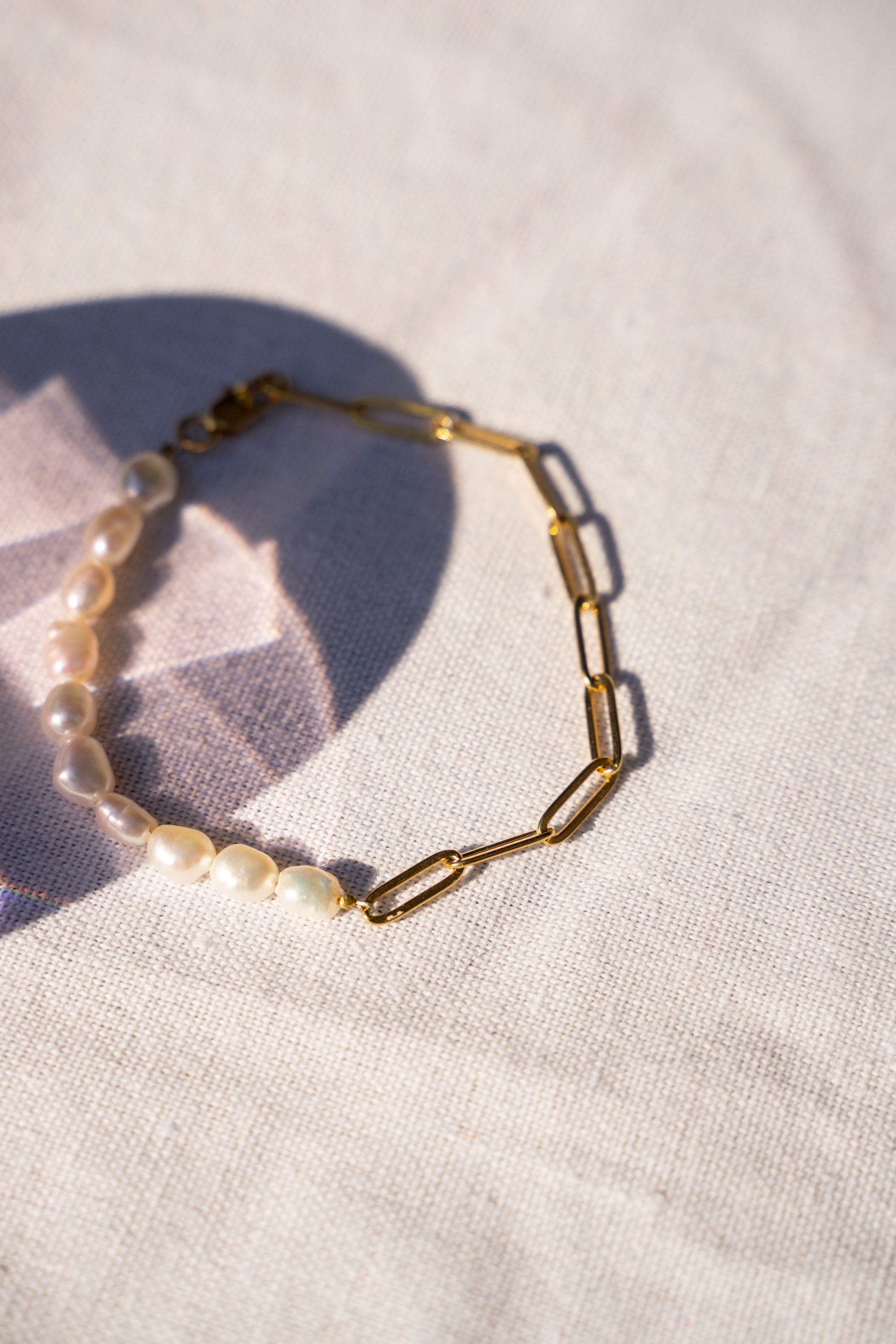Das Armband Alva besteht zur einen Hälfte aus Süßwasserperlen, zur anderen Hälfte aus Edelstahl. Durch diese zwei Materialien eignet es sich besonders gut für den Alltagslook, passt aber auch zu einer etwas schickeren Garderobe. Der Karabiner kann in ein Glied eingehakt werden und so passt das Armband wirklich allen.