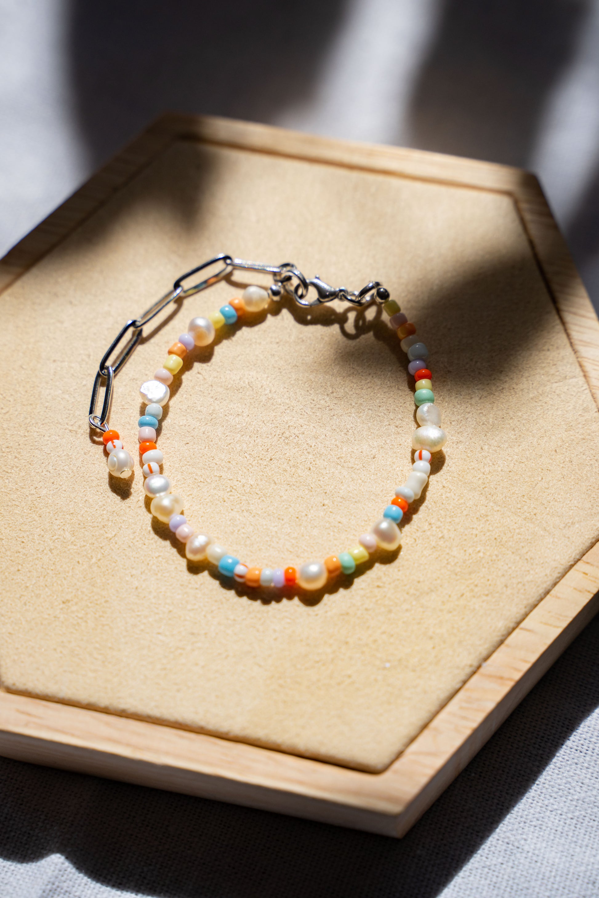 Gibt es etwas schöneres, als bunten Schmuck an warmen Sommertagen? Inspiriert durch die bunten Straßen von Madrid, bringt dich dieses Armband durch jeden heißen Tag. Durch seine verschiedenen bunten Perlen, in Kombination mit echten Süßwasserperlen, passt es einfach zu jedem Sommeroutfit. Auch im Winter schön um die graue Jahreszeit ein bisschen aufzuheitern.
