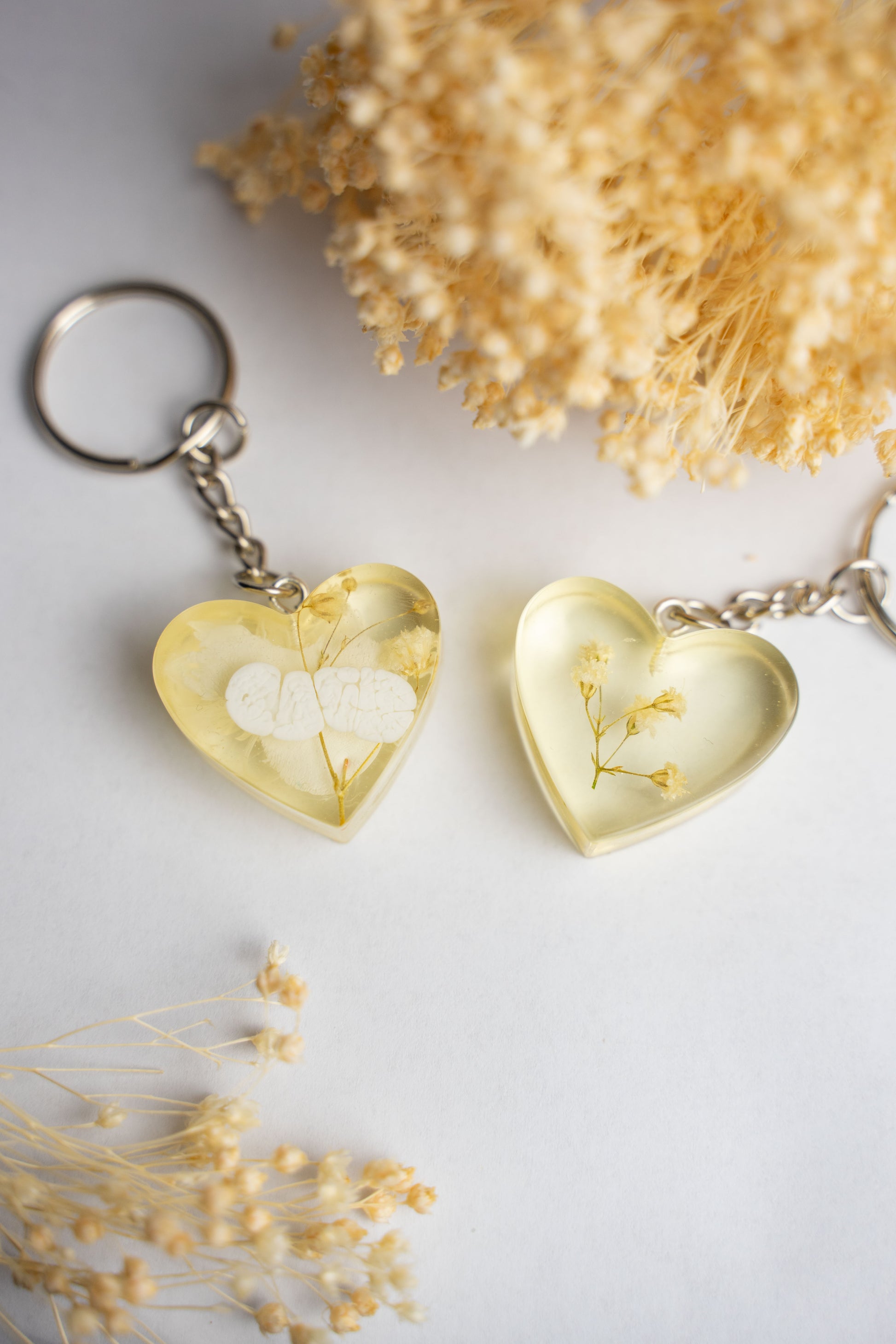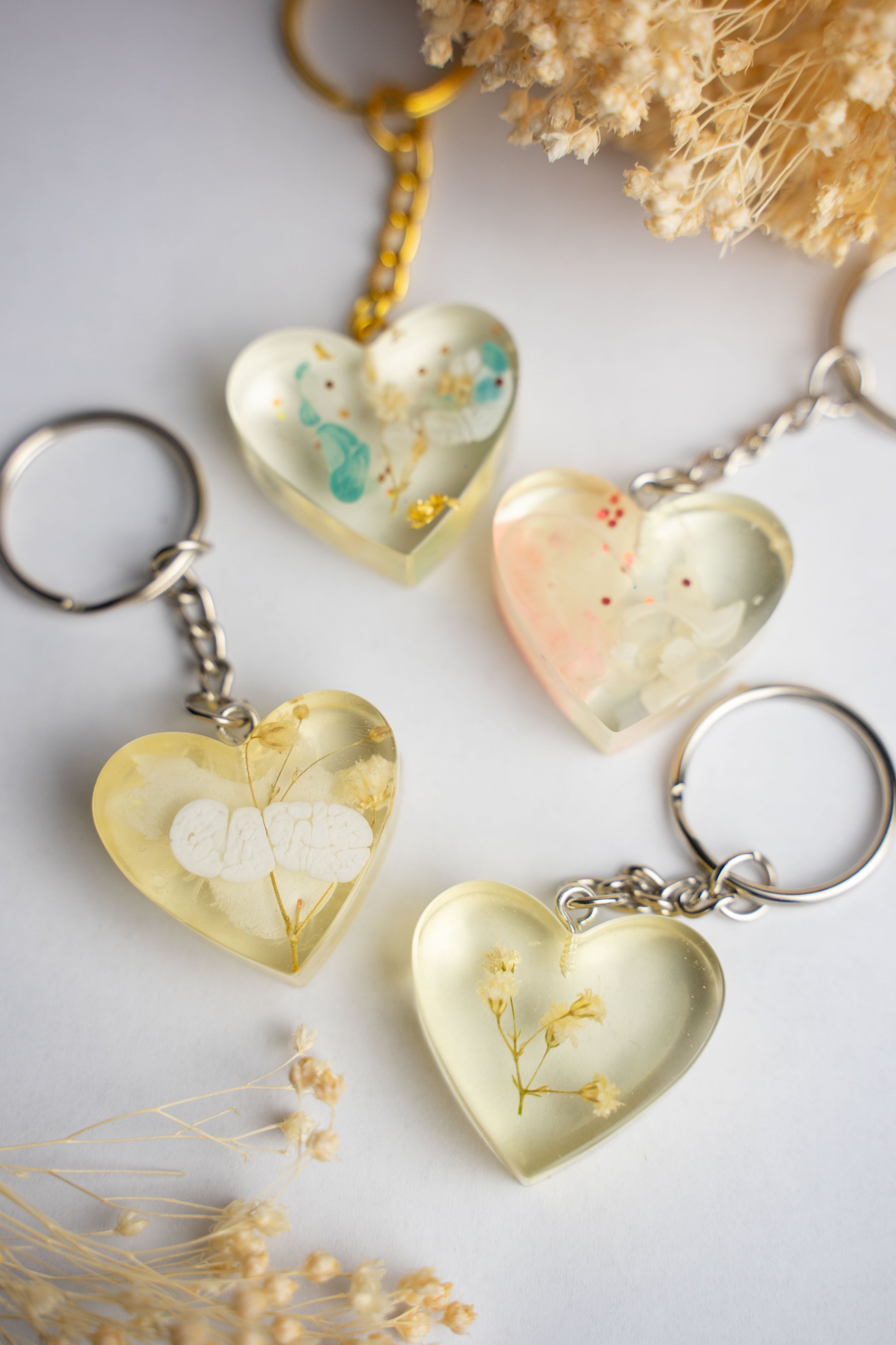 Epoxidharz ist eine Art Kunststoff. Die Produkte werden von Hand gegossen und mit Farben und Dekorationen, wie auch echten Blumen, veredelt.